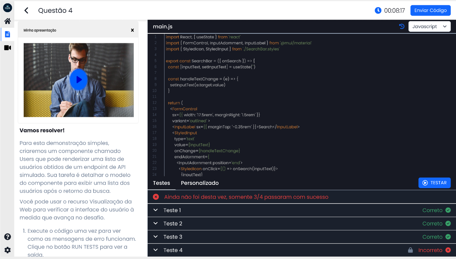 -> Programação (coding challenge, home test, system design);